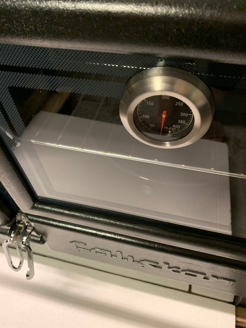 • Cast iron Oven door with large glass and thermostat.