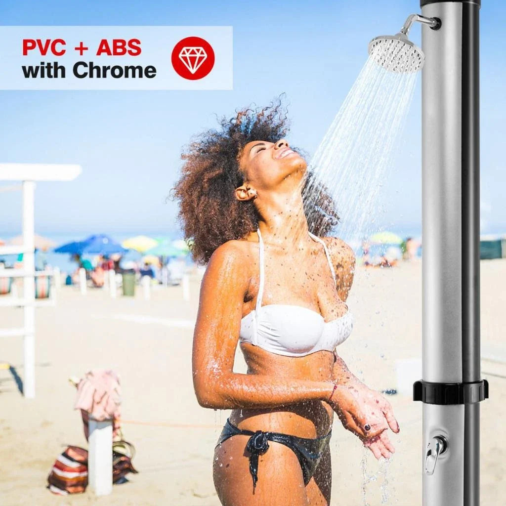 Solar-Powered Efficiency: Leveraging solar energy, this outdoor shower heats water in an eco-friendly manner, reducing electricity consumption and saving on bills. The structure is crafted from long lasting PVC and chrome-plated ABS materials, ensuring rust resistance and suitability for various weather conditions.