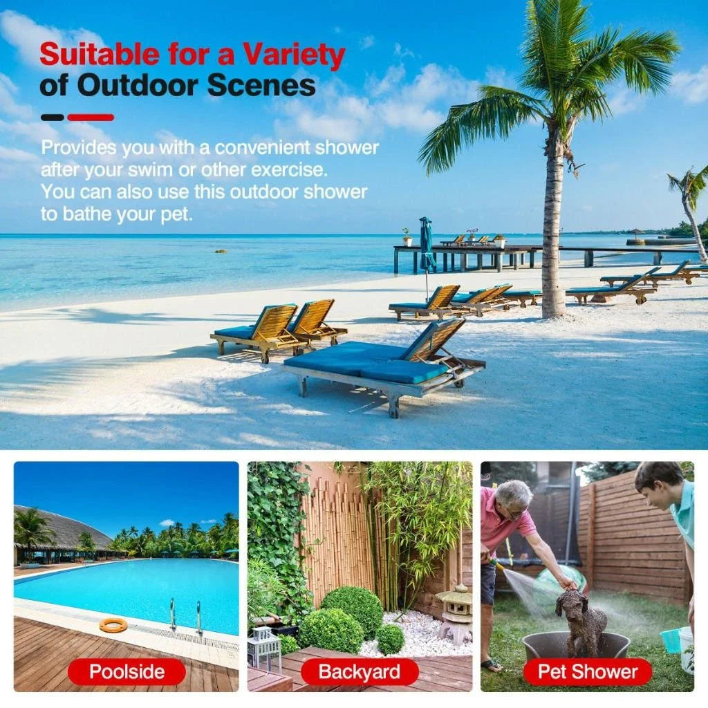 Ideal for Outdoor Activities: Perfect for enriching your outdoor living, this freestanding solar shower offers a refreshing experience whether you're cooling off under the hot sun or need a warm rinse. It's ideal for gardens, backyards, pool areas, beaches, and more, enhancing leisure and practicality in outdoor settings.